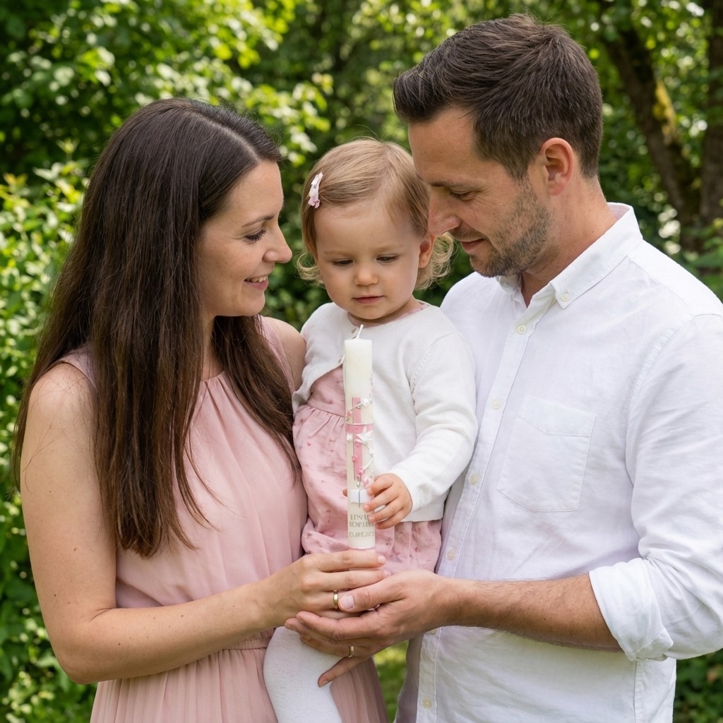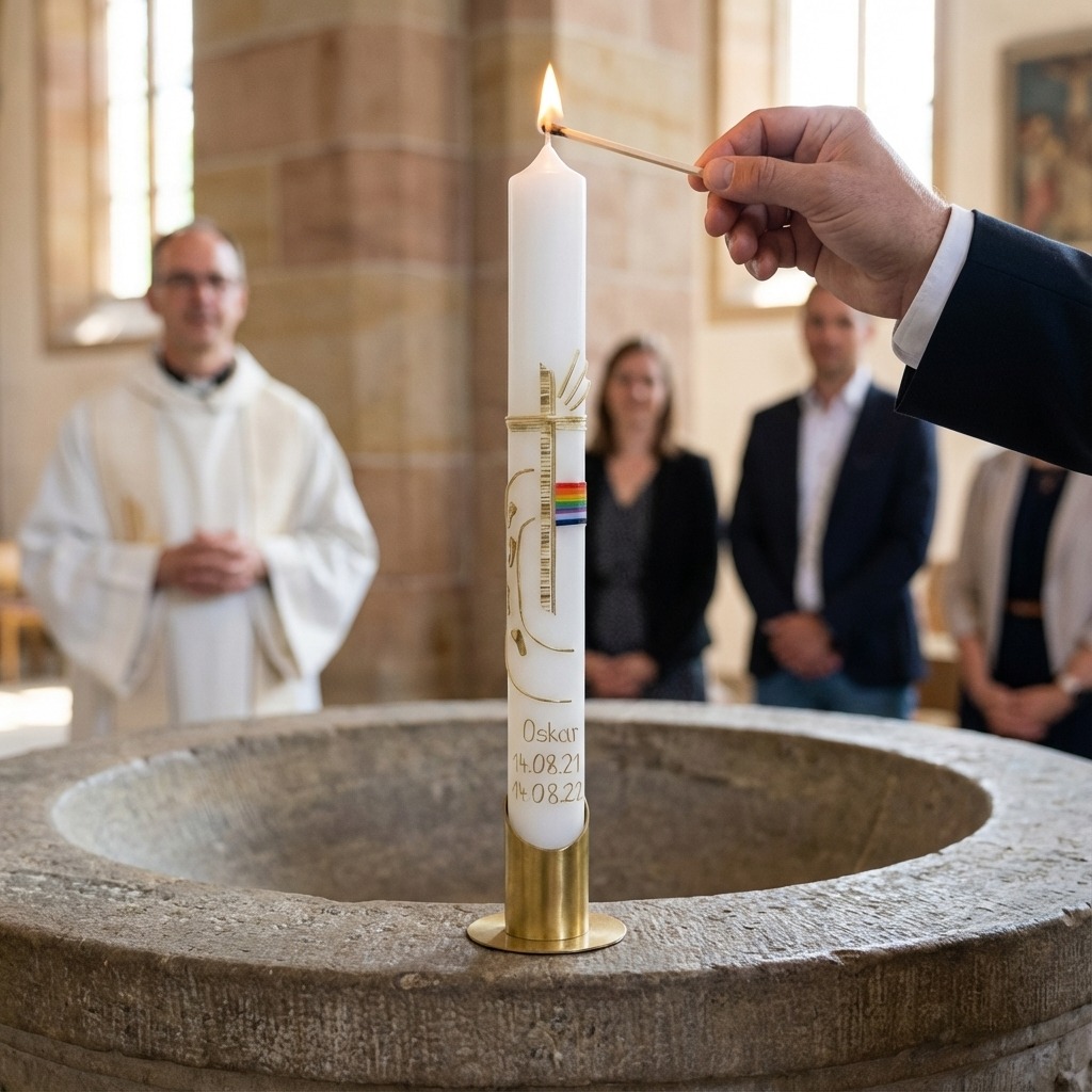 Sie steht für Licht, Hoffnung und den Weg im Glauben. Das Entzünden der Kerze macht sichtbar: Dieser Tag soll dem Kind Orientierung und Schutz geben.